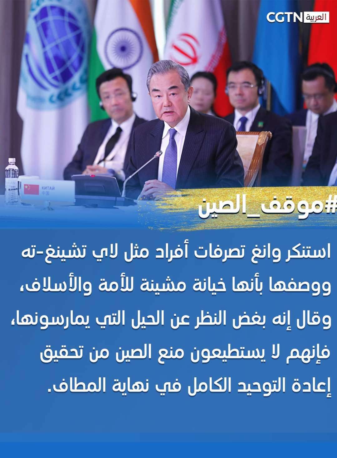 عرض وانغ، وهو أيضا عضو المكتب السياسي للجنة المركزية للحزب الشيوعي الصيني، موقف الصين الرسمي بشأن مسألة تايوان خلال كلمته أمام اجتماع لمجلس وزراء خارجية منظمة شانغهاي للتعاون في أستانا.