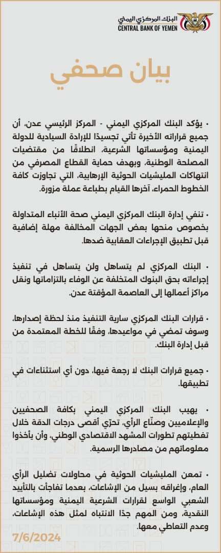 أصدر إعلام البنك المركزي اليمني عدن بيان صحفي ينفي فيه صحة ماورد بحديث وكيل البنك لقطاع الرقابة على البنوك منصور راجح لقناة اليمن اليوم من القاهرة، عن مهلة ممنوحة للبنوك الموقوفة وتريث من قبل البنك المركزي في إرسال القرارات الجديده لمحافظه أحمد بن غالب المعبقي إلى البنوك المراسلة رسميا بالسويفت لتتخذ إجراءاتها العقاقبية تجاه تلك البنوك الموقوفة.