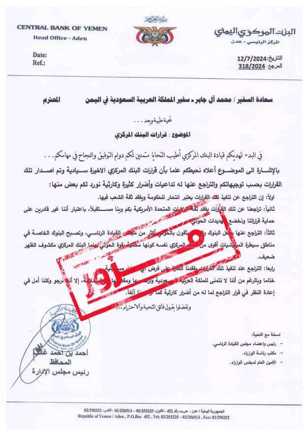 نودّ التنبيه بأن المذكرة المزورة المنسوبة إلى البنك المركزي اليمني، والتي تُدّعى أنها صادرة من محافظ البنك المركزي غير صحيحة.