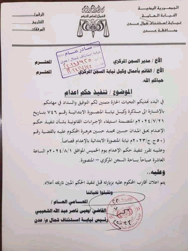 مذكرة صادرة عن رئيس نيابة استئناف شمال عدن القاضي يحيى الشعيبي، أقرت تنفيذ حكم الإعدام يوم الخميس 1 أغسطس 2024، الساعة العاشرة صباحا في السجن المركزي بالمنصورة، وذلك بعد استيفاء الإجراءات القانونية بشأن تنفيذ حكم الإعدام بحق المدان حسين محمد حسين هرهرة.