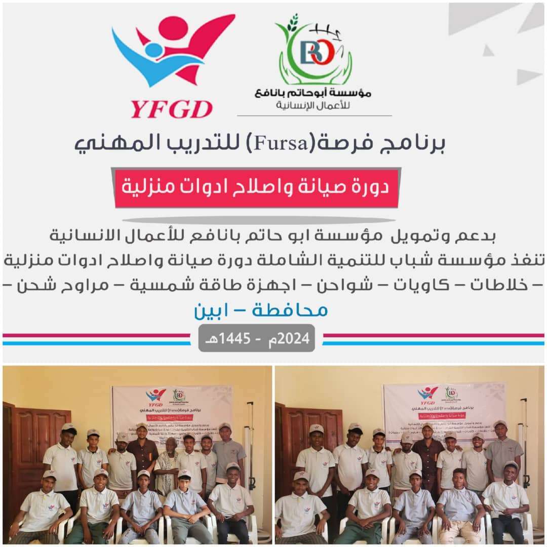 وفي اختتام برنامج فرصة لتدريب المهني عبرت مؤسسة شباب للتنمية الشاملة قطاع التدريب والتأهيل عن شكرها وتقديرها لمؤسسة أبو حاتم بانافع للأعمال الإنسانية لدعمها مشاريع التدريب والتأهيل المهني والفني والتمكين الاقتصادي للشباب المنقطعين عن التعليم والخريجين.والاميين من خلال برنامج فرصة لكسب مهن تساعدهم في دخول سوق العمل.