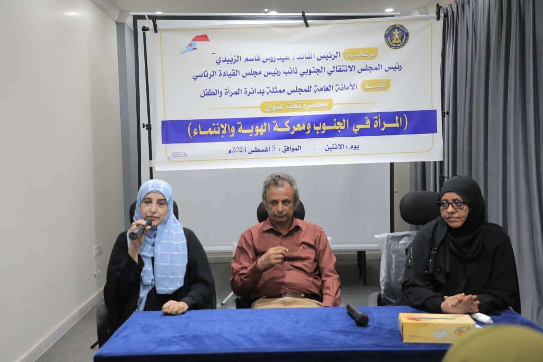 هذا وكانت قد افتتحت المحاضرة، الأستاذة ياسمين مساعد حُميد رئيس دائرة المرأة والطفل، بكلمة عبرت فيها عن سعادتها بتواجدها وسط كوكبة نسوية متميزة، مشيرة إلى أن المحاضرة تهدف لتسليط الضوء على دور المرأة الجنوبية المحوري في صراعنا المشروع للحفاظ على هويتنا وانتماءنا الجنوبي، باعتبارها هي نصف المجتمع، وهي شريكة أساسية في بناء مستقبلنا، وقد أثبتت على مر التاريخ أنها قادرة على تحمل المسؤولية والقيادة.