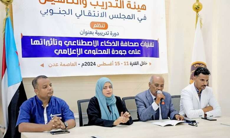 دشنت هيئة التدريب والتأهيل المساعدة لهيئة رئاسة المجلس الانتقالي الجنوبي، اليوم الأحد، دورة تدريبية بعنوان “تقنيات صحافة الذكاء الاصطناعي وتأثيراتها على جودة المحتوى الإعلامي”.