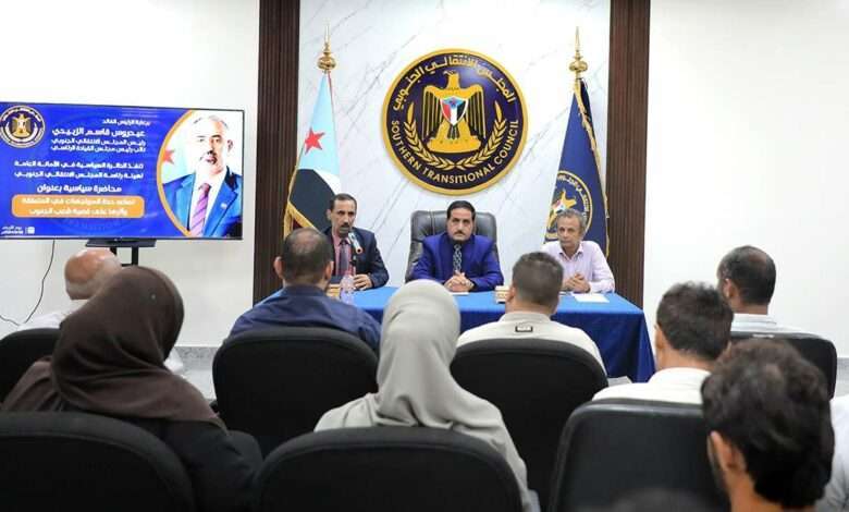 نظمت الدائرة السياسية بالأمانة العامة لهيئة رئاسة المجلس الانتقالي الجنوبي، اليوم الأربعاء في العاصمة عدن، محاضرة سياسية بعنوان “تصاعد حدة المواجهات في المنطقة وأثرها على قضية شعب الجنوب”.
