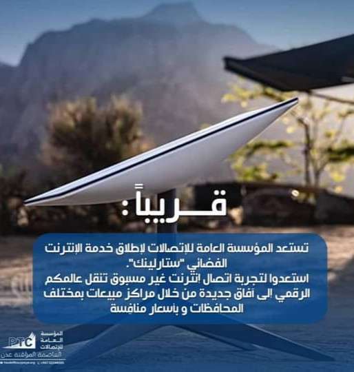 اعلنت المؤسسة العامة للاتصالات بعدن عن قرب إطلاق خدمة الإنترنت الفضائي "ستارلينك" وبدء استقبال طلبات توصيل كابلات الألياف الضوئية (Fiber).