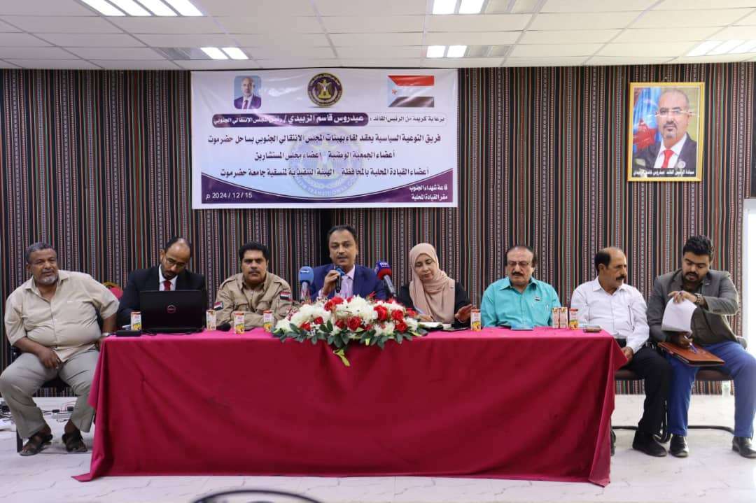 عقد فريق التوعية السياسية في المجلس الانتقالي الجنوبي، برئاسة الأستاذ فادي حسن باعوم، يوم الأحد، اجتماعًا موسعًا في مدينة المكلا، جمع أعضاء الجمعية الوطنية ومجلس المستشارين والقيادة المحلية لانتقالي ساحل حضرموت، بالإضافة إلى الهيئة التنفيذية لمنسقية الانتقالي في جامعة حضرموت.