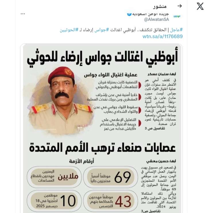 وذكرت صحيفة "الوطن" أن اغتيال اللواء ثابت جواس (من أبرز قادة الجيش اليمني، اغتيل في 2022)، لم يكن حادثًا أمنيًا معزولًا، بل جاء ضمن تفاهمات سياسية وأمنية معقدة، تورطت فيها أطراف إقليمية، وعلى رأسها دولة الإمارات، في إطار صفقات تبادل مصالح مع جماعة الحوثي.