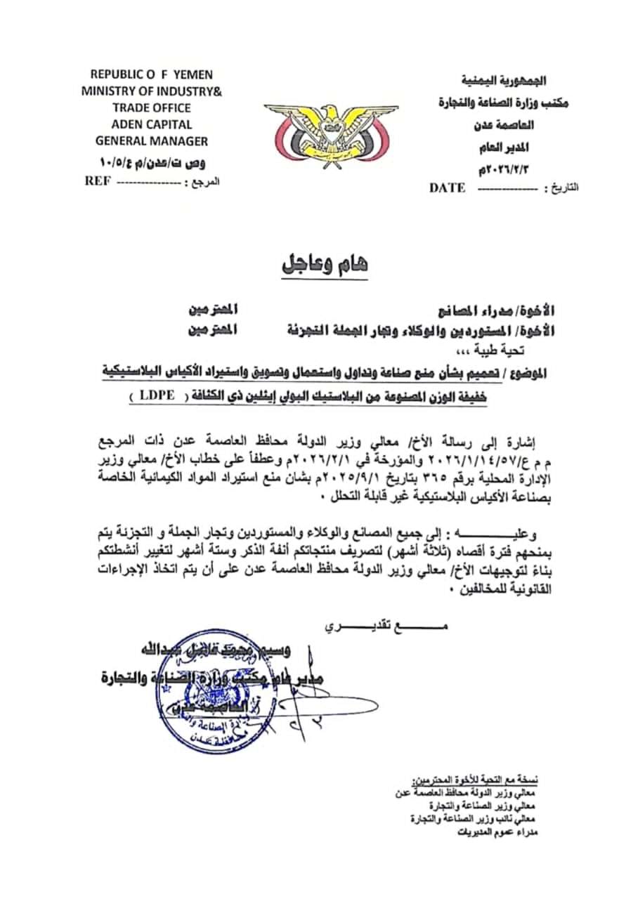 أصدر مكتب الصناعة والتجارة في العاصمة عدن تعميماً "هاماً وعاجلاً" يقضي بحظر صناعة وتداول واستيراد أ...