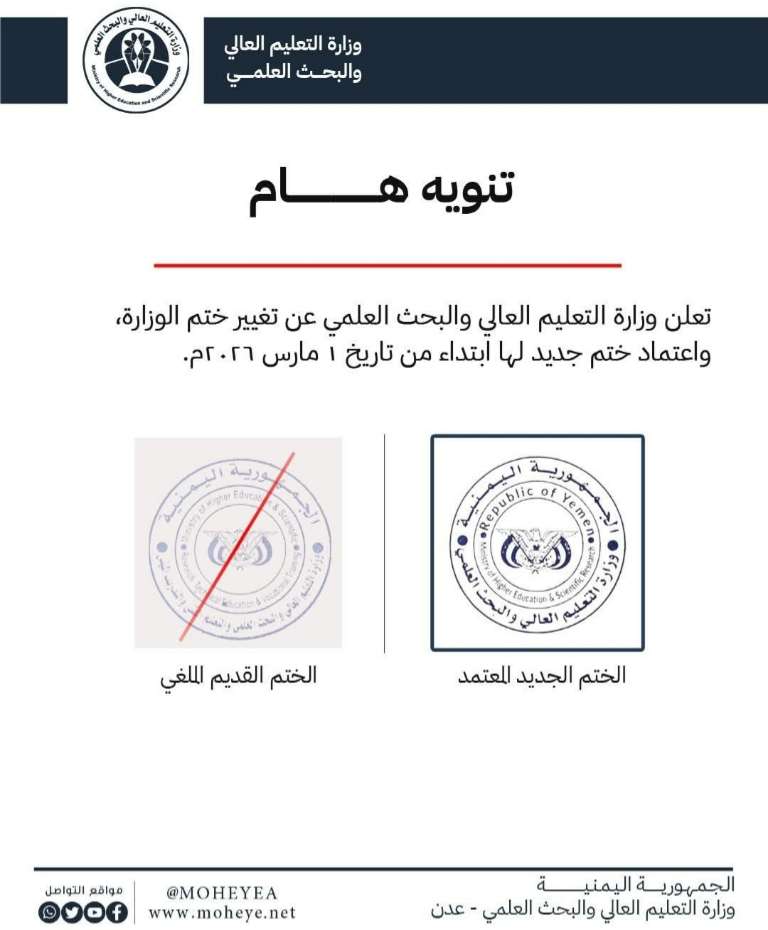 تعلن وزارة التعليم العالي والبحث العلمي، لكافة المؤسسات التعليمية، والجهات الحكومية، والطلاب، والجمهور الكريم، عن تغيير الختم الرسمي للوزارة واعتماد تصميم جديد ابتداءً من تاريخ 1 مارس 2026م.