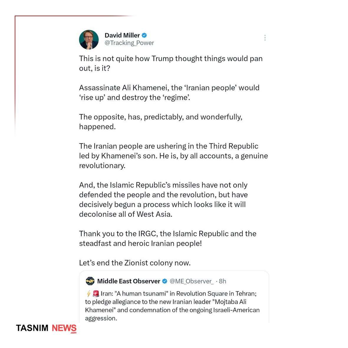 امتدح عالم الاجتماع البريطاني البارز  «ديفيد ميلر» في صفحته الشعب الإيراني في ثباته خلف قيادته ، وعن الفشل الذريع لسياسة الرئيس الأمريكي ترامب الذي فجر حرب ضد إيران وهو يعلم سلفا بسيارته لتلك الحرب . حيث قال