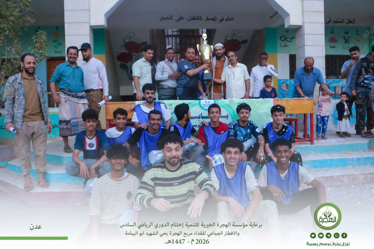 في أجواء رمضانية مفعمة بالحيوية والروح الرياضية، اختُتمت عصر يوم الأحد 26 رمضان 1447هـ الموافق 15 مارس 2026م فعاليات الدوري الرياضي الرمضاني السادس في حي الشهيد أبو اليمامة بمديرية المنصورة، والذي أُقيم برعاية مؤسسة الهجرة الخيرية للتنمية ضمن الحملة الرمضانية الثانية عشر وتحت شعار (رمضان عطاء وإحسان).
