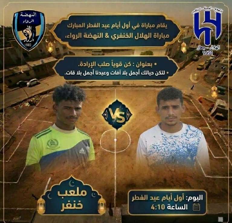 ضمن فعالياتها الهادفة إلى تعزيز القيم الإيجابية ونشر ثقافة الابتعاد عن القات، تنظم مبادرة “عيدنا أجمل بلا قات” مباراة كروية مميزة تجمع فريقي الهلال الخنفري والنهضة الرواء، وذلك في أول أيام عيد الفطر المبارك، عند الساعة الرابعة عصرًا، على ملعب نادي خنفر بمدينة جعار.
