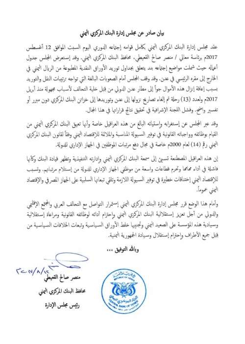 وأمام هذا الوضع قرر مجلس إدارة البنك المركزي اليمني إستمرار التواصل مع التحالف العربي والمجتمع الإقليمي والدولي من أجل تعزيز إستقلالية البنك المركزي اليمني واحترام أداءه لوظائفه القانونية ومراعاة استقلالية وسيادة هذه المؤسسة على الصعيد اليمني ، وتجنيبها خطر الاوراق السياسية وتبعات الخلافات السياسية من قبل جميع الاطراف وأحترام إستقلال وسيادة الجمهورية اليمنية .