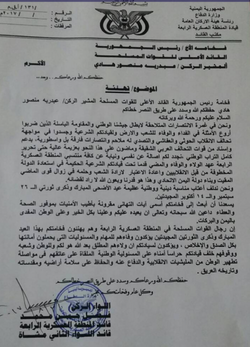 وأشار "اللواء عرب" في برقيته أن فخامة الرئيس هادي وعد فأوفى وتحدث فصدق وهاهي مرتبات منتسبي القوات المسلحة والأمن سيتم صرفها إبتداءا من يوم غدا بأعتبار أن القوات المسلحة والأمن هما الدرع الواقي والحصن الحصين لسيادة الوطن والذود عن مكتسباته الوطنية , لافتا إلى أن الجيش والأمن الوطني والمقاومة الشعبية كانت لهم أدوارا بطولية وعظيمة بالتصدي للأنقلابيين والوقوف ضد الأنقلاب التي قامت به مليشيات الحوثي وصالح وأنقلابهم على الشرعية الدستورية وشرعية فخامة الرئيس وكان لدورهما البطولي والتضحيات الجسيمة التي قدموها في تحرير عددا كبيرا من محافظات الجمهورية بأسناد دول التحالف العربي .