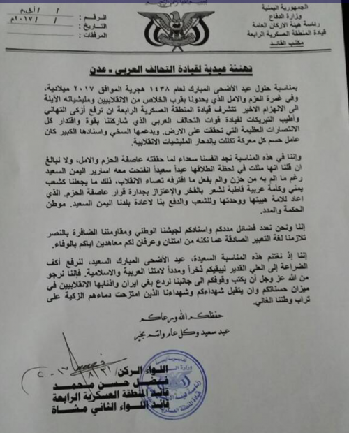 ووجه "اللواء عرب" تهانيه ومباركته لفخامة الرئيس هادي وكافة أبناء شعبنا اليمني العظيم بمناسبة حلول عيد الأضحى المبارك , متمنيا لفخامته موفور الصحة والعافية ولوطننا وشعبنا دوام التوفيق والنجاح والتقدم والإزدهار , سائلا المولى عز وجل أن يعيده علينا وعلى فخامتكم وعلى الوطن كافة وقد تحقق السلام الدائم والعادل , ونعم وطننا بالحرية والكرامة والعدالة , وساد الأمن والأمان والأستقرار ربوعه , وحلت الطمأنينة والسكينة كافة أرجاء وطننا الحبيب.