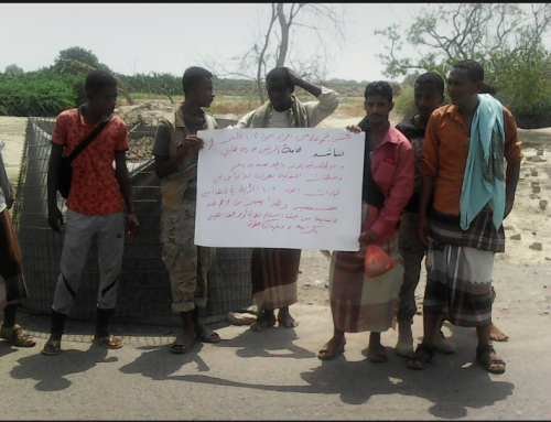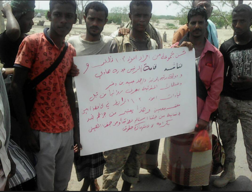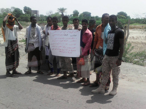 نفذ العشرات من أفراد اللواء 103 المرابط بمنطقة جحين يوم الإثنين 2017/9/4 م وقفة احتجاجية سلمية في منطقة الكود للمطالبة بصرف روتبهم اسوة بزملائهم في الألوية العسكرية الأخرى وحسب بقرر دولة رئيس مجلس الوزراء .