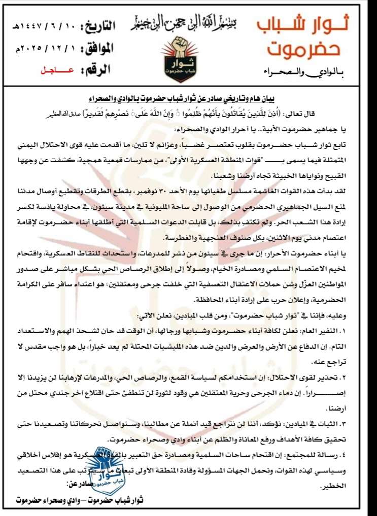 ثوار شباب حضرموت” يعلنون النفير العام ويحذرون “المنطقة العسكرية الأولى” عقب أحداث القمع في سيئون