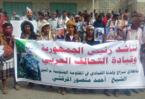 و ألقيت كلمةً عن اللجنة التنسيقية للوقفة الإحتجاجية ألقاها الشيخ حسن فضل المرقشي طالب فيها رئاسة الجمهورية ممثلةً بفخامة رئيس الجمهورية المشير عبدربه منصور هادي ورئيس الحكومة د. أحمد عبيد بن دغر و محافظ أبين اللواء الركن أبوبكر حسين وقيادة التحالف العربي في عدن التي تحتجز الشيخ المرقشي بإطلاق سراحه ورفاقه المحتجزين منذ أشهر في سجن قيادة التحالف العربي .