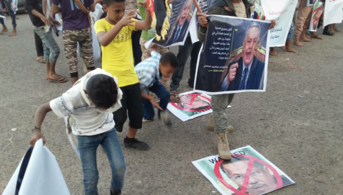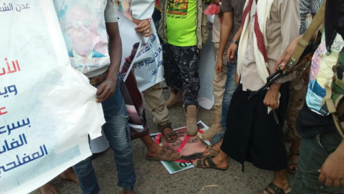 وفي الوقفة الاحتجاجية وضع أبناء عدن صور رئيس الحكومة الدكتور أحمد عبيد بن دغر تحت أقدامهم وداسوا عليها كما رفع أبناء عدن صور المحافظ المفلحي ولافتتات أكدوا خلالها رفضهم لإستالقة المحافظ المفلحي .