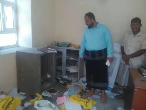 وعبر اليزيدي عن استغرابه وأسفه الشديدين لما لحق بهذا المرفق الخدمي من عبث لمحتويات مكاتبه وسرقة خزنتها بعد فتحها بإطلاق النار عليها متسترين بأصوات الإشتباكات الذي أستغلها الجناة لتغطية جريمتهم ، وكذا محاولة إشعال النار لمكتب مدير عام المديرية.