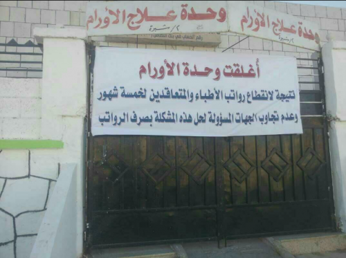 و ذلك بسبب انقطاع مرتبات الأطباء و العاملين والمتعاقدين في الوحدة الصحية لعلاج الأورام السرطانية.