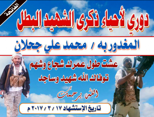 ومن خلال هذا المهرجان الكروي المتواضع نحن أبناء منطقة الكود وأبناء المراقشة نناشد السلطة المحلية بالمحافظة ممثلة بالأخ اللواء الركن أبو بكر حسين سالم محافظ المحافظة ومدير الامن العام ومدير الامن السياسي وقائد الحزام الامني أبين بالبث في قضية الشهيد « محمد علي جحلان » الذي مر عام كامل على استشهاده ولم تتخذ أي اجراءات نناشدكم بالبث في هذه القضية المرفوعة اليكم واحالتها إلى النيابة العامة والقضاء لاتخاذ الاجراءات اللازمة ودمتم عونا لأبناء محافظة أبين ودم أبنائها أمانه في أعناقكم.