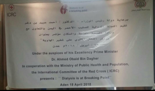 أقامت اللجنة الدولية للصليب الاحمر في اليمن , بالتعاون مع وزارة الصحة العامة والسكان , اليوم في العاصمة المؤقتة عدن , مؤتمرا صحفيا حول وضع مراكز الغسيل الكلوي في اليمن بعنوان " مراكز الغسيل الكلوي على شفير الهاوية " , وذلك برعاية رئيس الوزراء الدكتور احمد عبيد بن دغر .