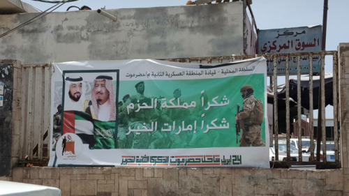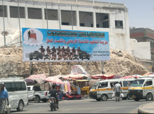 ورفعت خلال الأيام الماضية يافطات إعلانية على مداخل ومخارج مدينة المكلا والمدن الرئيسية وعلى الجولات والساحات العامة ونقاط التفتيش والطرق الرئيسية.