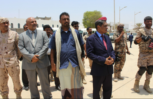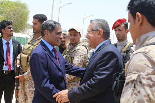 وكان في استقباله في مطار الريان الدولي محافظ حضرموت قائد المنطقة العسكرية الثانية اللواء الركن فرج سالمين البحسني ووكيل أول حضرموت الشيخ عمرو بن حبريش ووكيل المحافظة لشؤون الوادي والصحراء عصام الكثيري والعميد ركن عويضان سالم عويضان اركان حرب المنطقة العسكرية الثانية والعميد سالم عبدالله الخنبشي مدير عام الامن والشرطة ووكلاء المحافظة والوكلاء المساعدين واعضاء مجلسي النواب والشورى ومديرو المكاتب التنفيذية والقيادات العسكرية والامنية وقطاع المرأة .