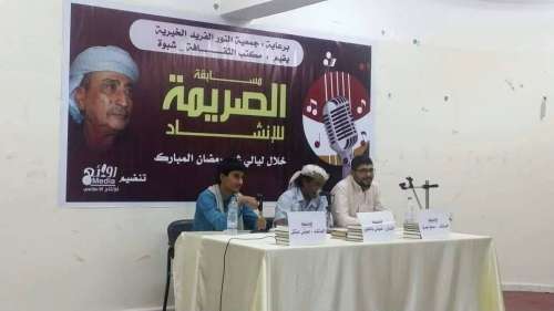 انطلقت مساء أمس بمكتبة الثقافة بمحافظة شبوة مسابقة الصريمة للإنشاد الذي يقيمها مكتب الثقافة بالمحافظة وبرعاية كريمة من مؤسسة النور الفريد الخيرية وتنظمه مؤسسة روائع ميديا للإنتاج الإعلامي .