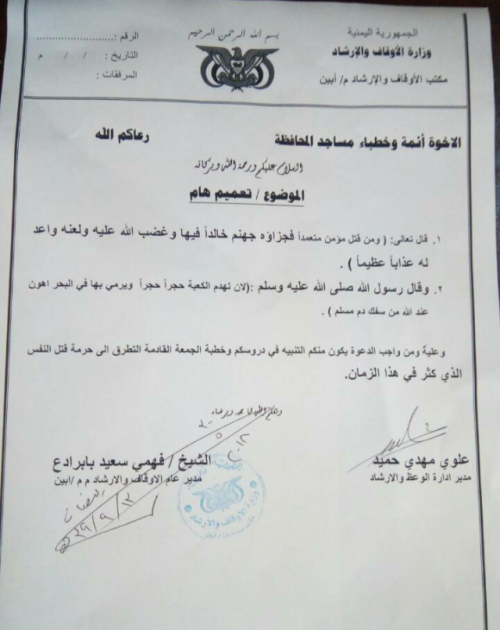 أصدر مدير عام مكتب الأوقاف في محافظة أبين الشيخ فهمي بابرادع تعميما إلى أئمة وخطباء المساجد بالمحافظة يدعوهم فيه إلى التنبيه في خطب الجمعة وأثناء تعليم الدروس الدينية إلى حرمة قتل النفس.
