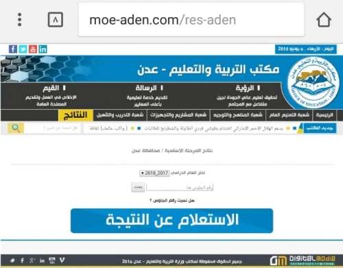 نشر موقع مكتب التربية والتعليم صباح اليوم نتائج اختبارات النتيجة العامة لاختبارات الصف التاسع للعام الدراسي 2017 - 2018 ويمكن للجميع الان الحصول على النتيجة من خلال الرابط الآتي: http://moe-aden.com/res-aden