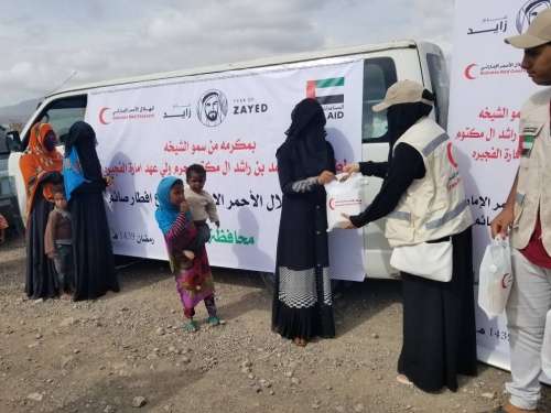 ووقف عشرات الأطفال والنساء والرجال يتلقون مساعدات الهلال التي جاءت ضمن برنامج مساعدات سمو الشيخة لطيفة بنت محمد بن راشد آل مكتوم حرم سمو ولي عهد إمارة الفجيرة في اطار مشروع "إفطار صائم" الذين ينفذه الهلال الأحمر الإماراتي في المحافظات اليمنية المحررة طيلة أيام شهر رمضان المبارك .
