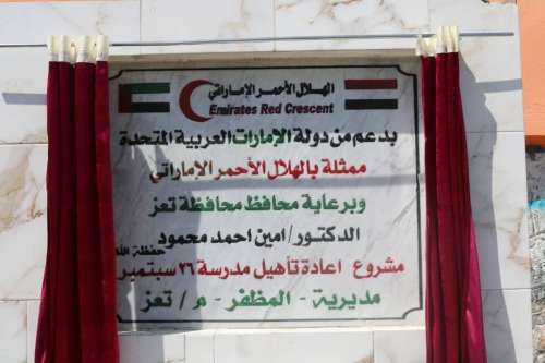 افتتحت هيئة الهلال الأحمر الإماراتي ، اليوم ، مدرسة 26 سبتمبر في محافظة تعز ، بعد استكمال اعمال الترميم ، التي استمرت أشهر بعد ما تعرضت للقصف والدمار من قبل المليشيات الحوثية ، وخروجها من دائرة العمل التربوي منذ ثلاثة أعوام .