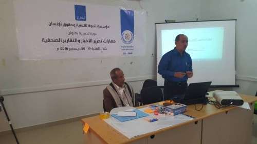 أقامت مؤسسة شبوة للتنمية وحقوق الإنسان، صباح اليوم الأربعاء دورة صحفية بعنوان "مهارات تحرير الأخبار وإعداد التقارير الصحافية" في مديرية عتق عاصمة محافظة شبوة.