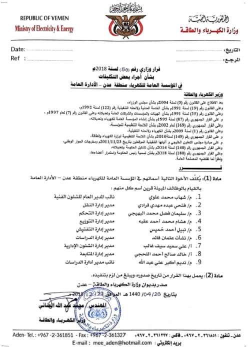 أصدر معالي وزير الكهرباء والطاقة قرار رقم 50 قضت المادة الأولى منه بتكليف الأخوة التالية اسمائهم في المؤسسة العامة للكهرباء منطقة عدن / الإدارة لعامة بالقيام بالوظائف المبينة قرين كل اسم منهم :