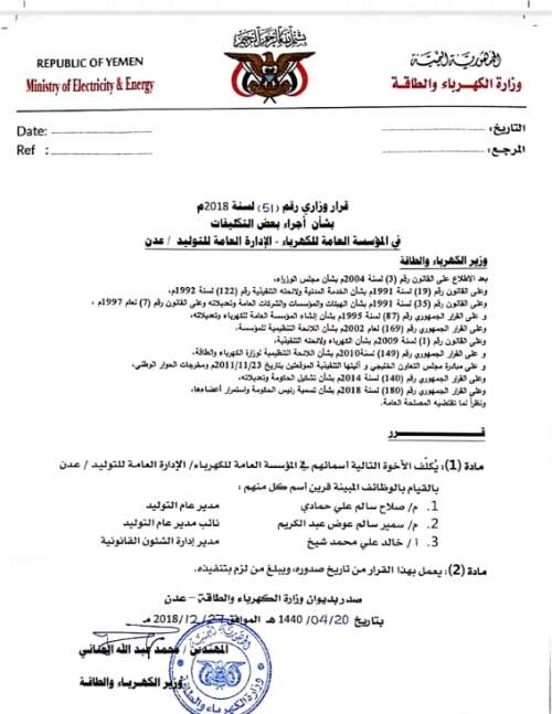 كما أصدر معالي وزير الكهرباء والطاقة الاستاذ محمد العناني قرارا رقم 51 قضت المادة الأولى منه بتكليف الأخوة التالية اسمائهم في المؤسسة العامة للكهرباء / الإدارة العامة للتوليد بعدن بالقيام بالوظائف المبينة قرين كل اسم منهم :