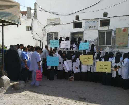 كادر مستشفى المكلا للأمومة والطفولة ينظمون وقفة احتجاجية رفضاَ للحملات والمغالطات الإعلامية على المستشفى وإدارتها