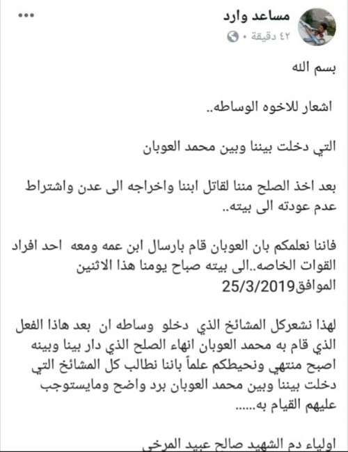 طالب أولياء دم الشهيد صالح المرخي على الفيسبوك لجنة الوساطة التي وقعت الهدنة بين أولياء دم الشهيد صالح المرخي وبين قائد القوات الخاصة العقيد محمد العوبان برد مقنع بعد خرق العوبان للهدنة.