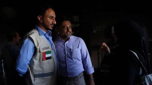 مندوبي الهلال الأحمر الاماراتي قاموا فور وصولهم الى المدينة بتوزيع المساعدات الإنسانية على السكان المتضررين.