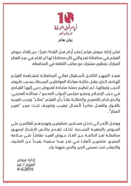 منعت السلطات المحلية في مدينة تعز، عرض الفيلم اليمني“10 أيام قبل الزفة“، الذي كان من المقرر عرضه في المدينة خلال إجازة عيد الفطر.