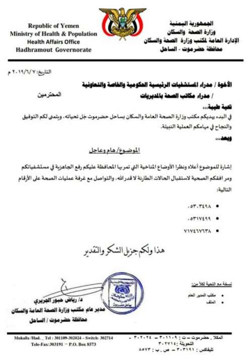 وجه المدير العام لمكتب الصحة العامة والسكان بساحل حضرموت الدكتور رياض حبور الجريري مدراء المستشفيات الرئيسية الحكومية والخاصة والتعاونية ومدراء مكاتب الصحة بالمديريات برفع جاهزيتهم تحسبا لحدوث أي حالات طارئة نتيجة المنخفض الجوي الحالي الذي تشهده مدينة المكلا ومدن وقرى المديريات الأخرى.
