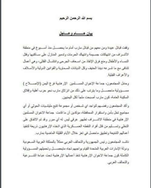 وقفت قبائل عبيدة ومن معهم من قبائل مارب أمام ما يحصل منذ أسبوع في منطقة الأشراف من انتهاكات جسيمة وانتهاك الحرمات وتدمير المنازل على ساكنيها وقتل النساء والأطفال ومنع فرق الإنقاذ من اسعاف الجرحى وانتشال القتلى، وهي أعمال تتنافى مع ما شرعه ديننا الحنيف وكل الديانات السماوية والقوانين الدولية والأسلاف والأعراف القبلية.