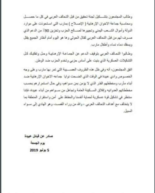 وطالبوا التحالف العربي بتوقيف الدعم عن الجماعة الإرهابية وحل وتفكيك كل التشكيلات العسكرية الذي بنيت على أساس حزبي وتخدم الحزب ضد الوطن.