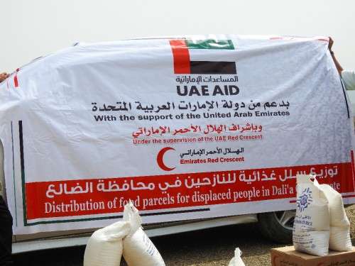 بدعم من دولة الإمارات سير الهلال الأحمر قافلة مساعدات إنسانية لنازحي محافظة الضالع.