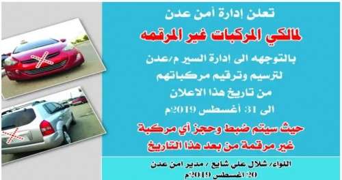 ولفتت ادارة امن عدن سائقي المركبات غير المرقمة بان بعد الفترة المحددة سيتم حجز أي سيارة غير مرقمة وعرضة لاجراءات قانونية.