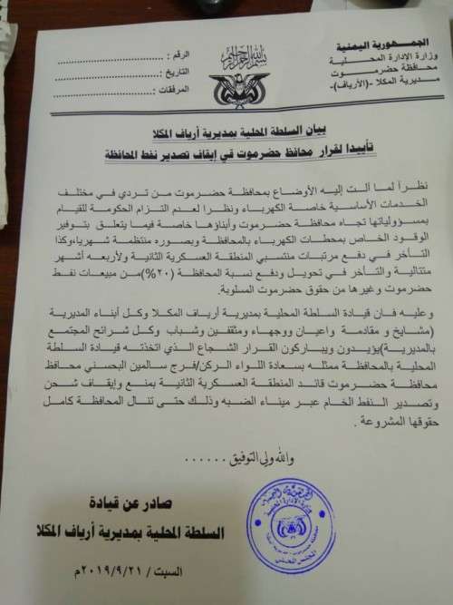 وعليه فان قيادة السلطة المحلية بمديرية ارياف المكلا وكل ابناء المديرية (مشايخ ومقادمة واعيان ووجهاء ومثقفين وشباب وكل شرائح المجتمع بالمديرية )يؤيدون ويباركون القرار الشجاع الذي اتخذته قيادة السلطة المحلية بالمحافظة ممثلة بسعادة اللواء الركن/فرج سالمين البحسني محافظ محافظة حضرموت قائد المنطقة العسكرية الثانية بمنع وايقاف شحن وتصدير النفط الخام عبر ميناء الضبة وذلك حتى تنال المحافظة كامل حقوقها المشروعة والله ولي التوفيق