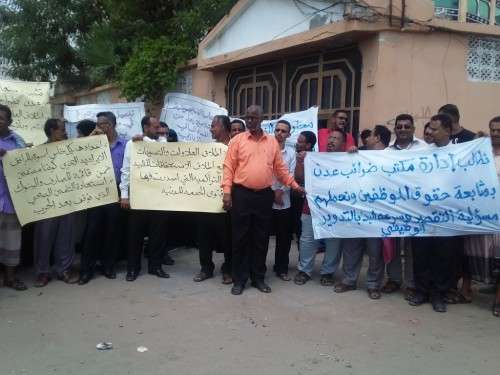 نظم موظفو مكتب ضرائب عدن صباح اليوم وقفة احتجاجية امام مبنى المصلحة العامو للضرائب بمنطقة ريمي .
