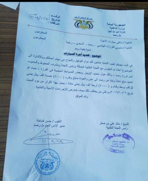 حيث أقر الجميع بإقرار إيجار الراكب ذهاباً وإياباً من مديرية رصد يافع إلى العاصمة عدن ، كذلك والعودة منها بمبلغ خمسة ألف ريال يمني (5000) للراكب وسط وقدام، وبسعر أربعة ألف ريال (4000) ريال يمني للراكب في الخانة.