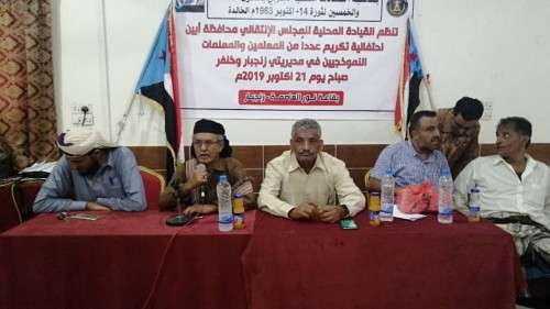 نظمت القيادة المحلية للمجلس الانتقالي بمحافظة ابين صباح اليوم بقاعة نور بعاصمة المحافظة زنجبار،حفل تكريم العدد من المعلمين والمعلمات النموذجيي.وياتي هذا تكريم في إطار احتفالات الشعب الجنوبي بمناسبة ذكرئ ال56 لثورة الرابع عشر من اكتوبر المجيد"